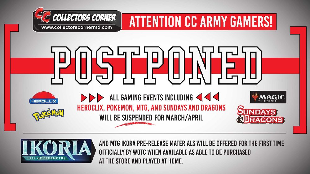At Collectors Corner stores we will continue to remain OPEN for Customers during our Regular Hours but May Adjust to Limited Hours if need be but as of right now will be OPEN Every Day, Updates Each Day to Hours or Services we can Offer. Please Keep in mind your Continued Support of Local Businesses in times like these is helpful. We have postponed ALL hosting of any events such as Pokemon, Magic the Gathering and Sundays & Dragons and above all else, we want those who work and play games at CC Stores to be as safe and secure as possible for all Customers and Staff.