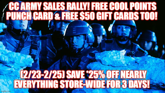 CC ARMY SUPPORT THE STORES SALES RALLY! 25%-60-90% Off Store-wide @ Both CC Store Locations for 3 Days. Friday 2/23 - Monday 2/25 + Cool Points Punch Card Launches & Free $50 Electronic Store Gift Cards Given Away Saturday - 2/24 All Day and more!