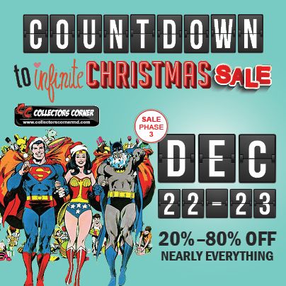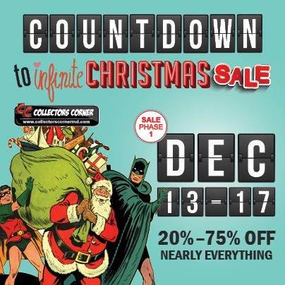 FIRST 50 In Line at ALL 3 Store Locations Get a CC Holiday Tote Bag Stuffed with Over $25 in Merchandise, including but not limited to Graphic Novels, Comics & Collectibles. Plus Each Bag will Contain A X-Mas Eve $10 Gift Certificate Good for use towards any purchase of $100 or more, usable with Sale Discounts Applied.
