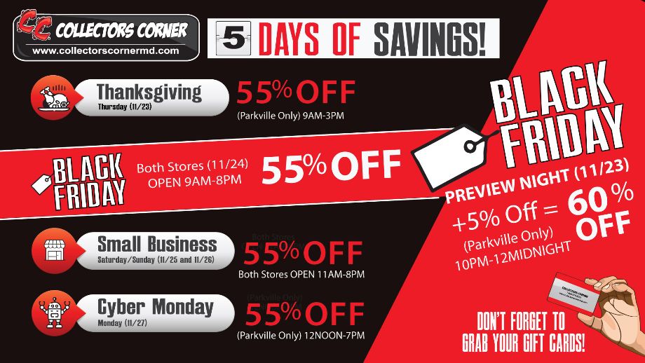 Sunday 11/26 CC Parkville HQ OPEN Noon-6PM, CC Bel Air Outpost OPEN 11AM-5PM. 55% Off