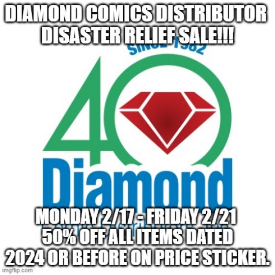 DIAMOND COMICS DISASTER RELIEF SALE 50% OFF ENTIRE STORE 5 DAYS ALL MERCH DATED 2024.