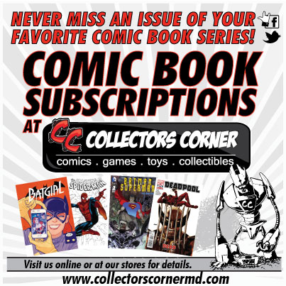 SUBSCRIPTION MEMBERSHIP: ONLINE - Contact Us to Sign up for 3 by or more monthly ongoing comics titles, magazines or manga and never miss an issue again + Save 10% Off any Bagged & Boarded BACK ISSUES, BOARD GAMES, GRAPHIC NOVELS, MANGA & Special Orders. MANAGE Your Subscription from home ONLINE as well by logging into your account at www.collectorscornermd.com after you have SIGNED UP by Contacting Us.